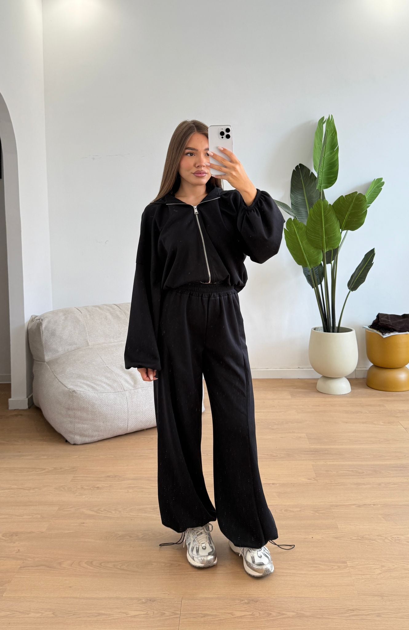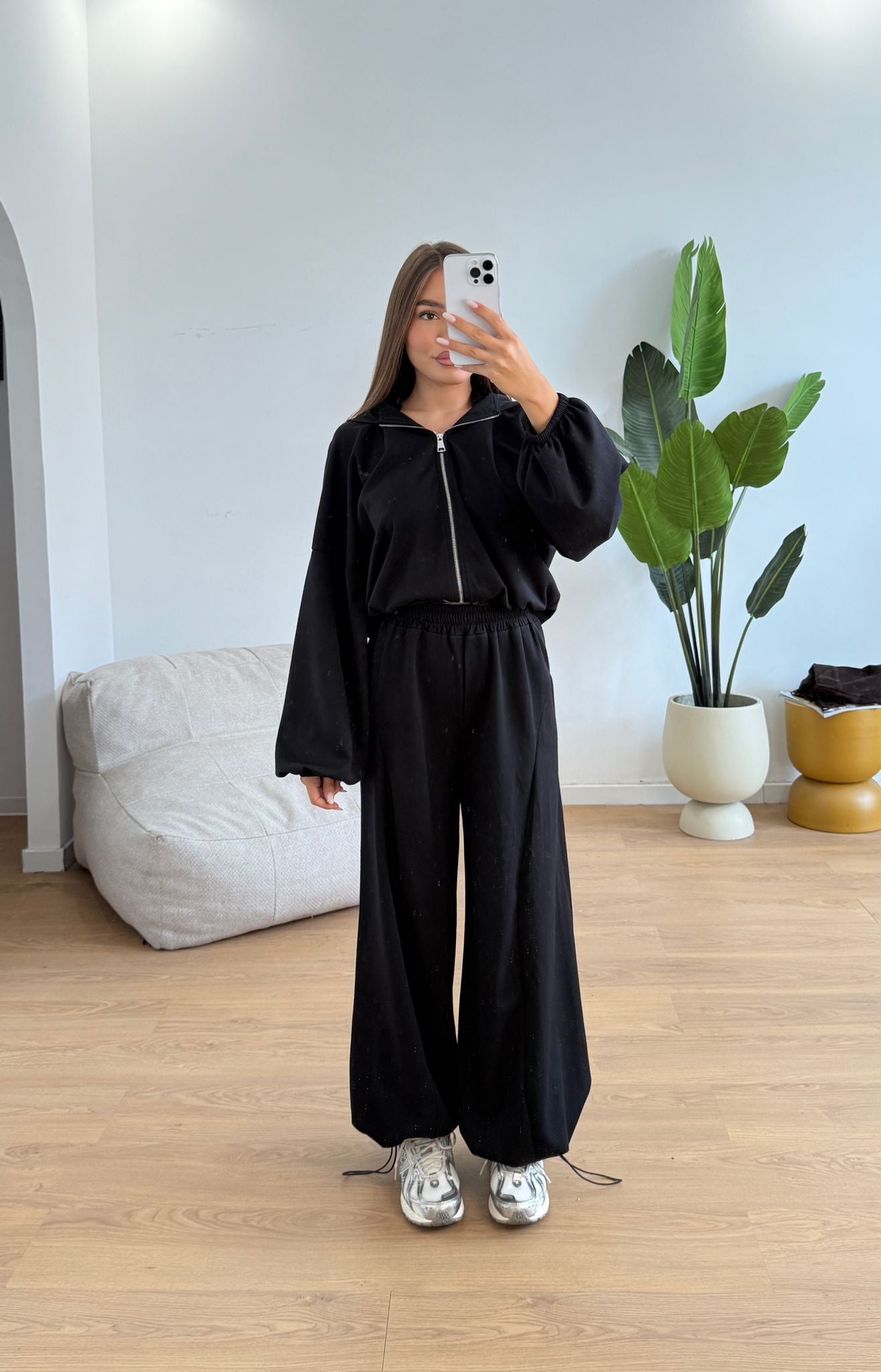 Coordinato da donna composto da felpa over con polsini e chiusura zip sul davanti e pantalone con elastico in vita e coulisse sul finale e vestirà bene fino ad una M/L