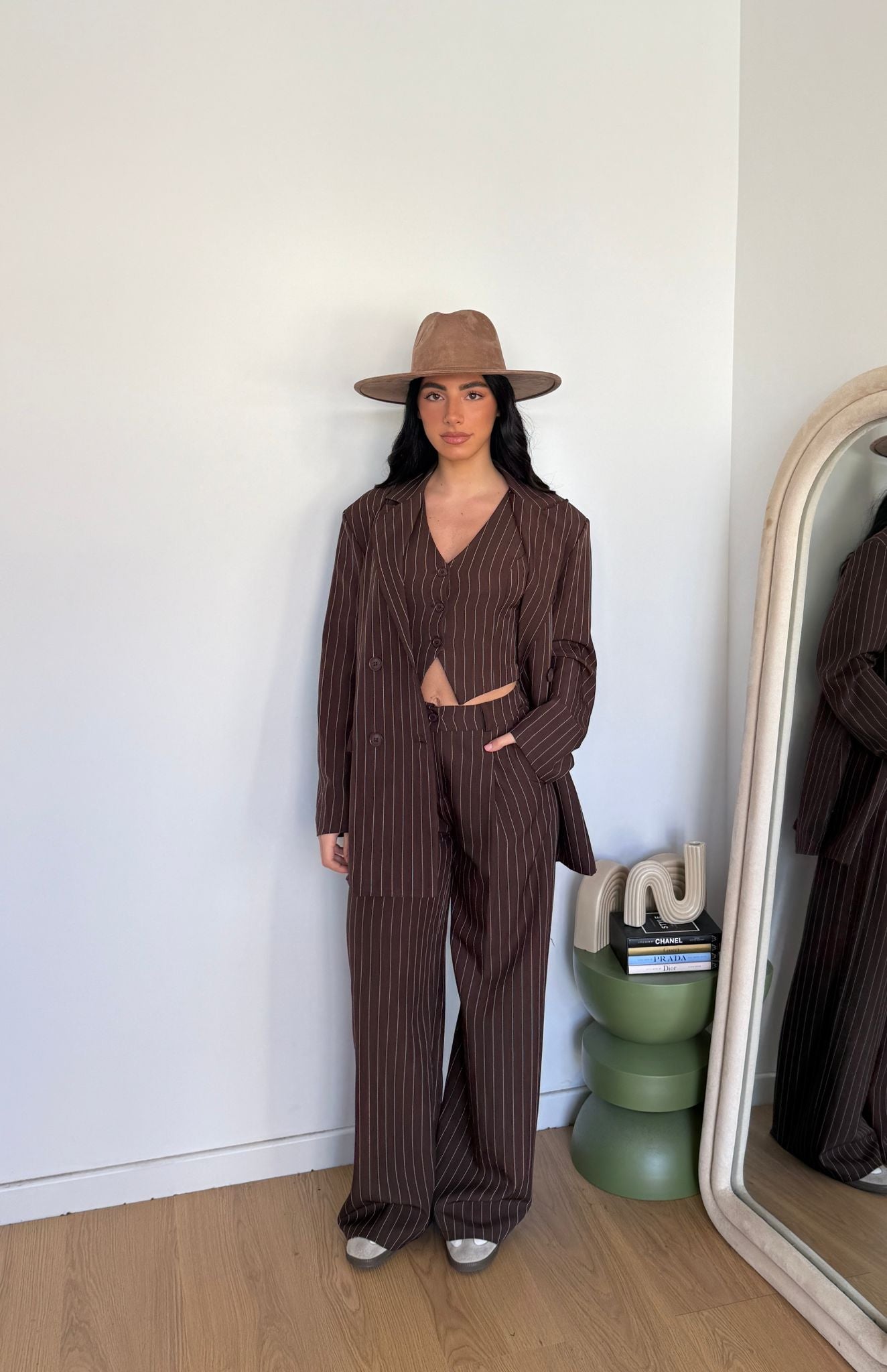 Coordinato da donna gessato composto da giacca con spalline imbottite, foderata internamente, gilet e pantalone con elastico in vita sul retro. Taglia unica, veste bene fino ad una 44.
