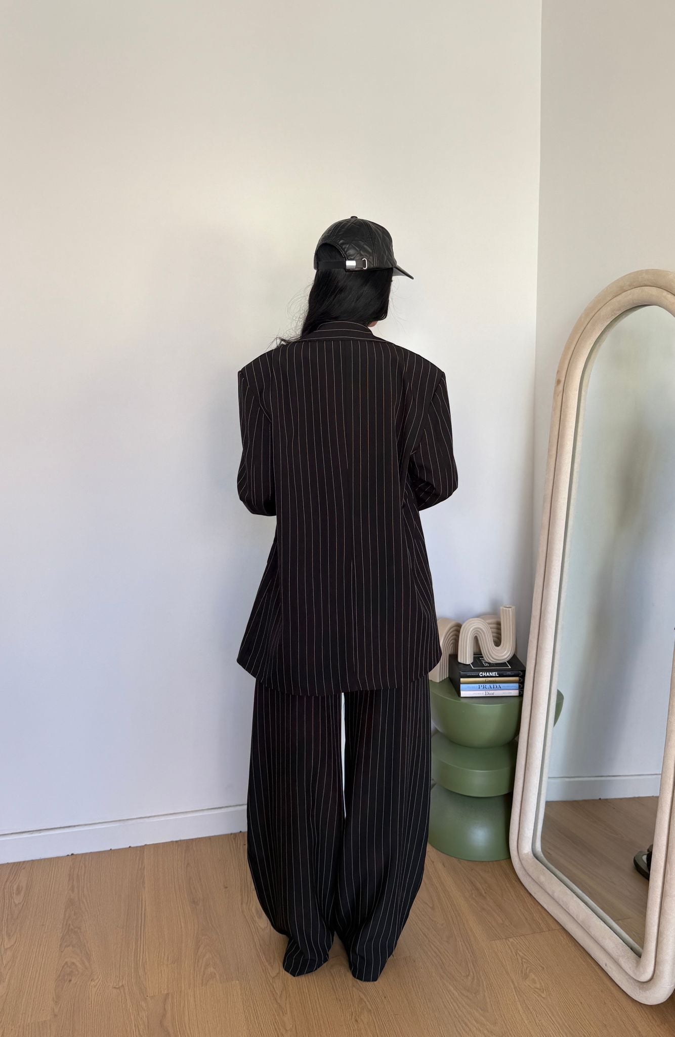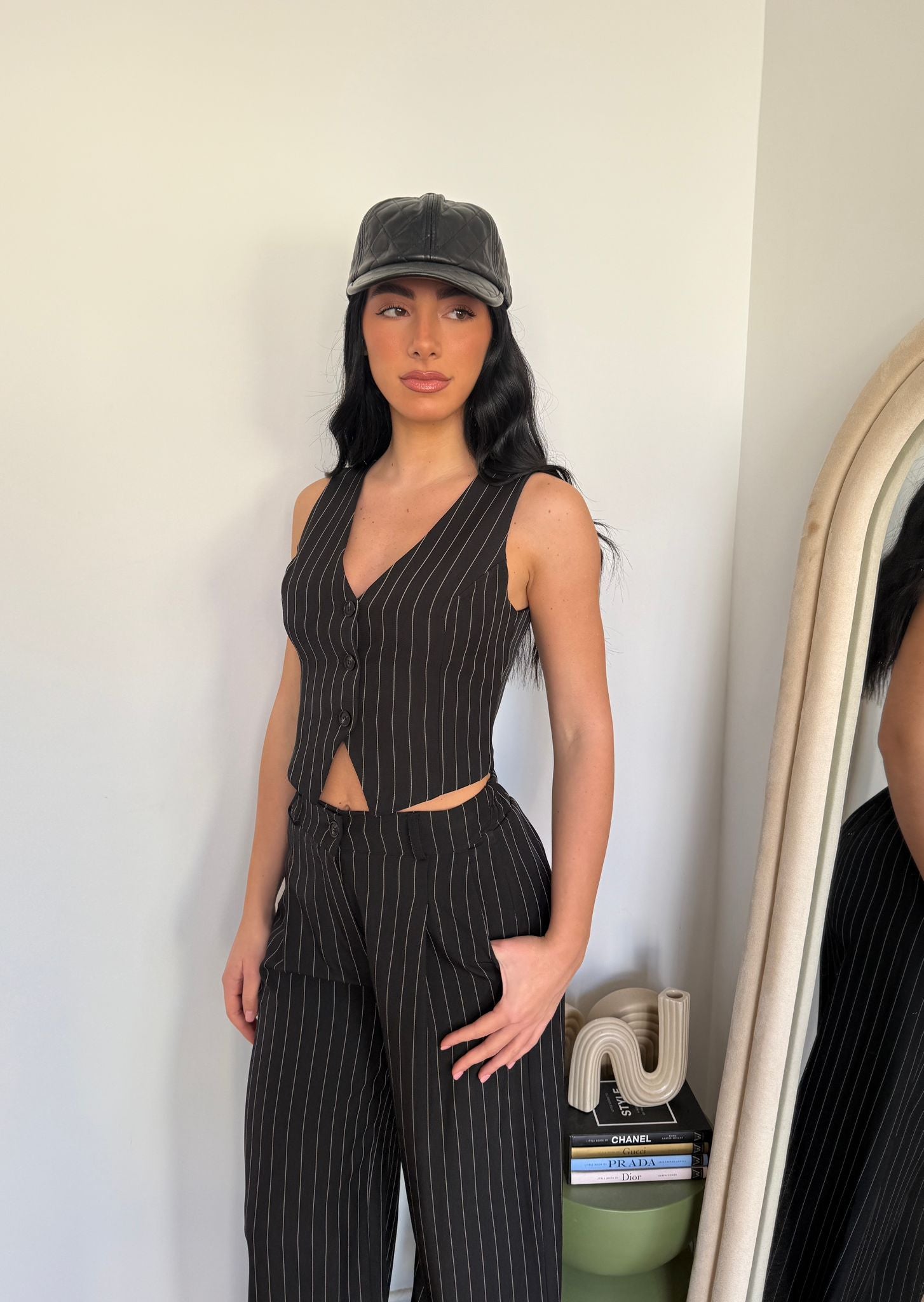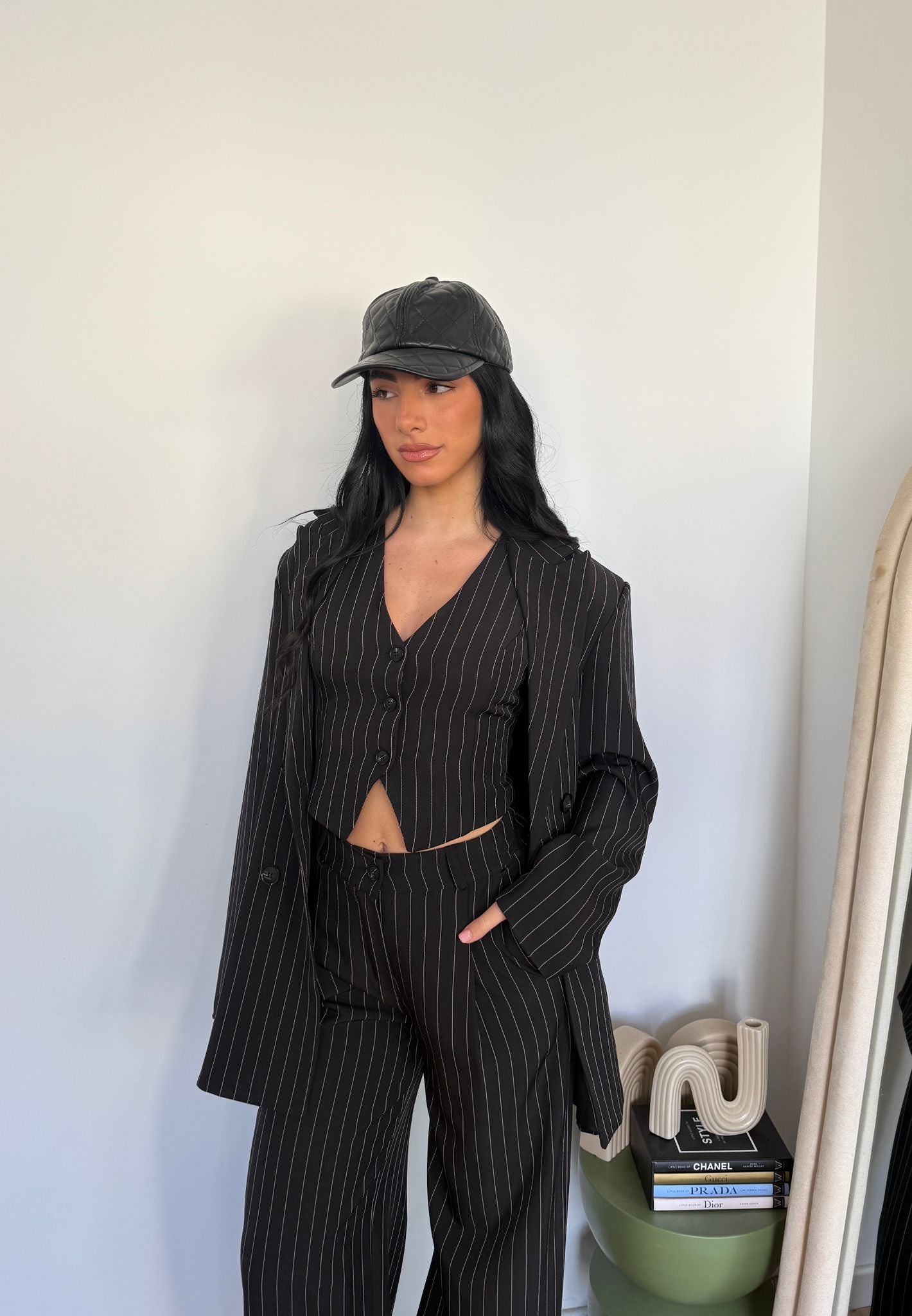Coordinato da donna gessato composto da giacca con spalline imbottite, foderata internamente, gilet e pantalone con elastico in vita sul retro. Taglia unica, veste bene fino ad una 44.