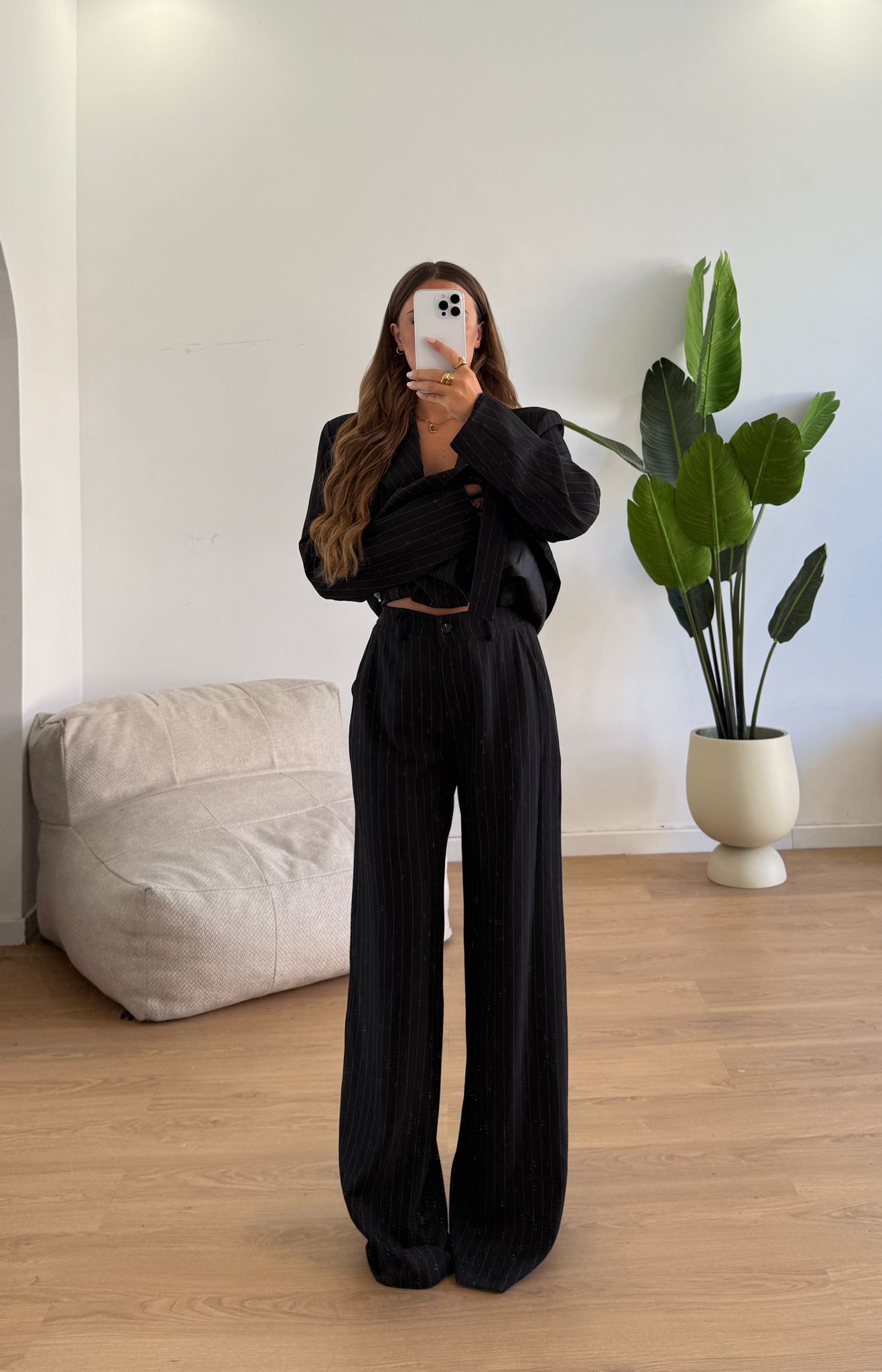 Coordinati da donna composto da giacca con spalline imbottite e cintura e pantalone con elastico in Vita sul retro, vestita bene fino ad una M/L