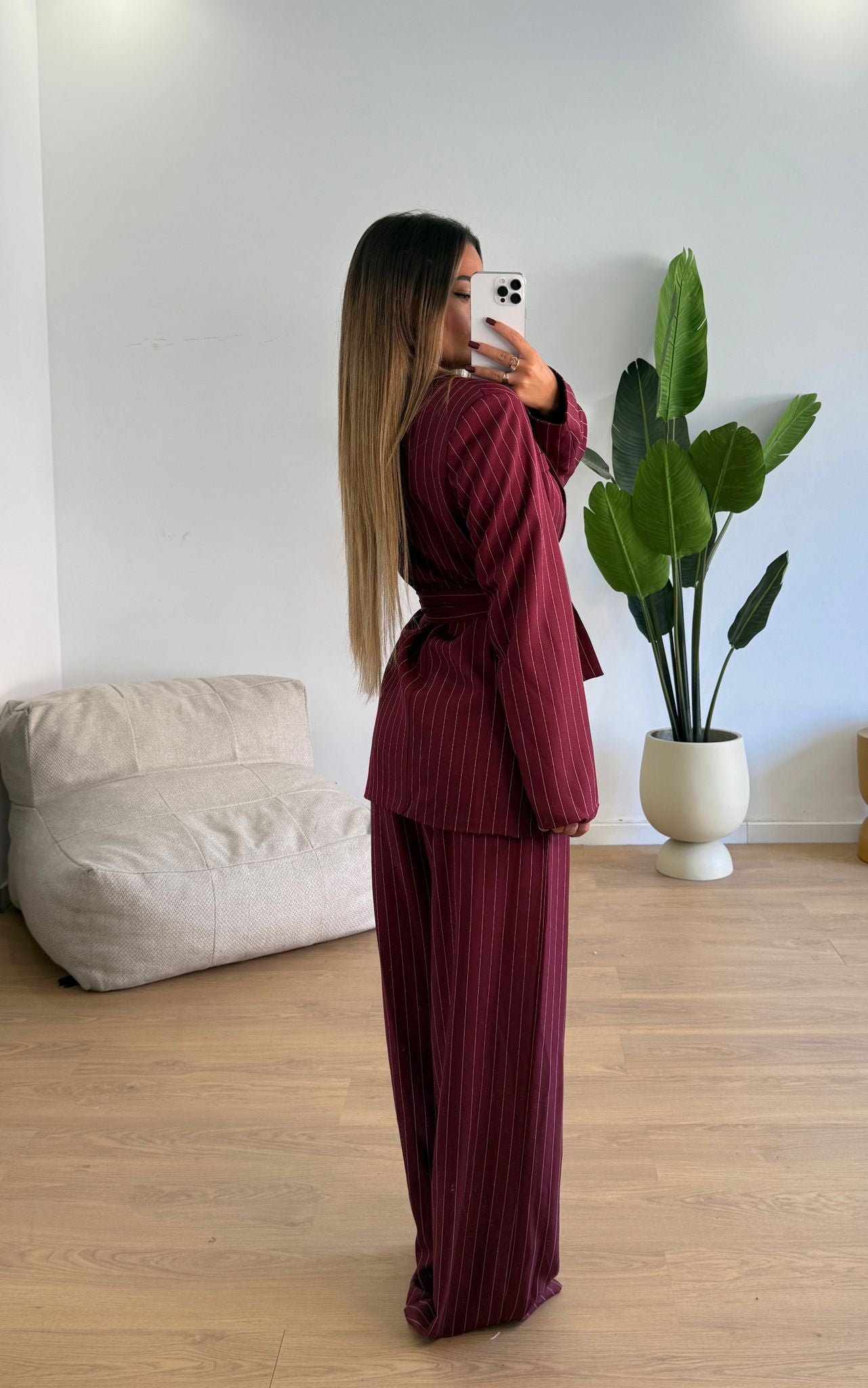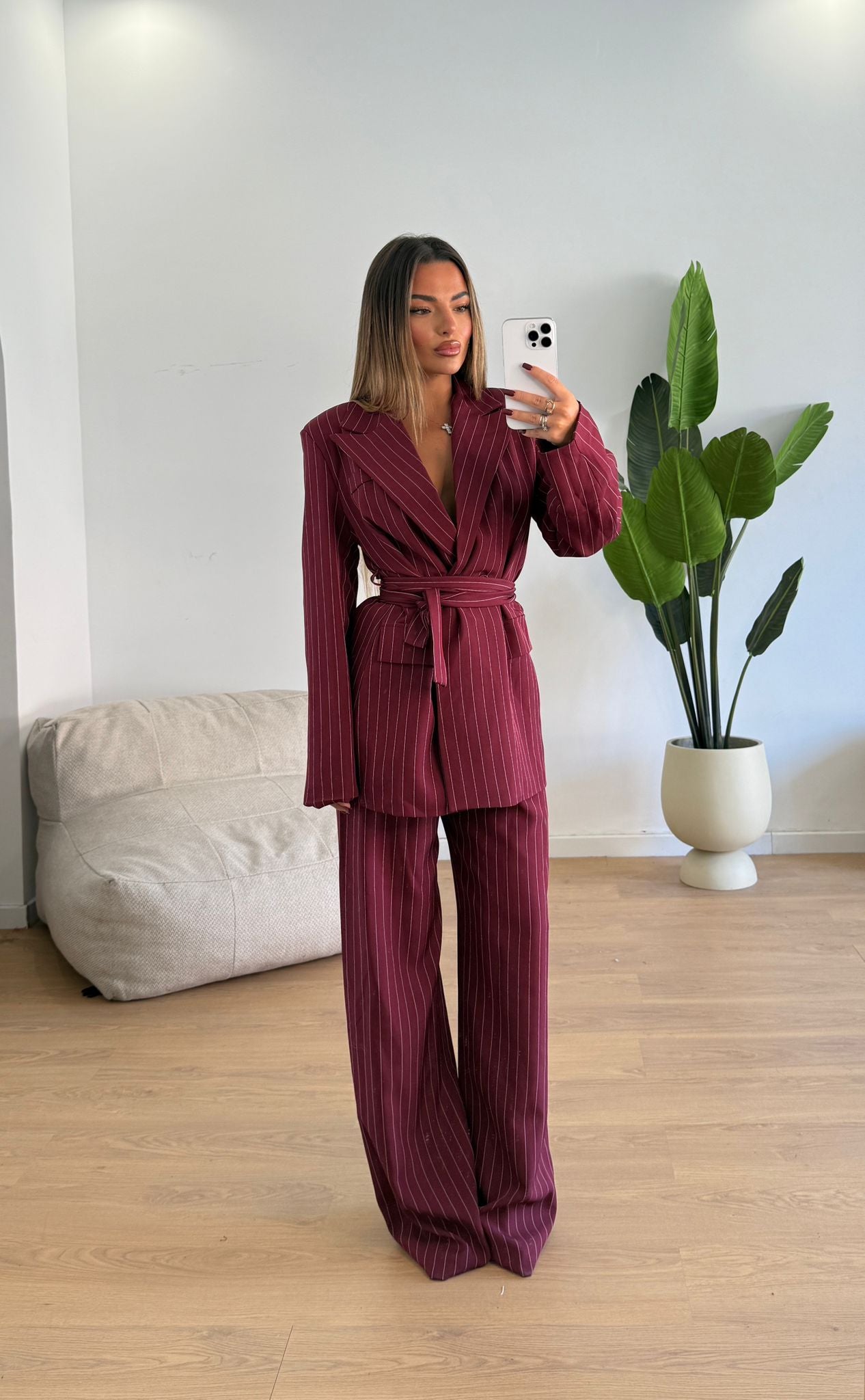 Coordinati da donna composto da giacca con spalline imbottite e cintura e pantalone con elastico in Vita sul retro, vestita bene fino ad una M/L