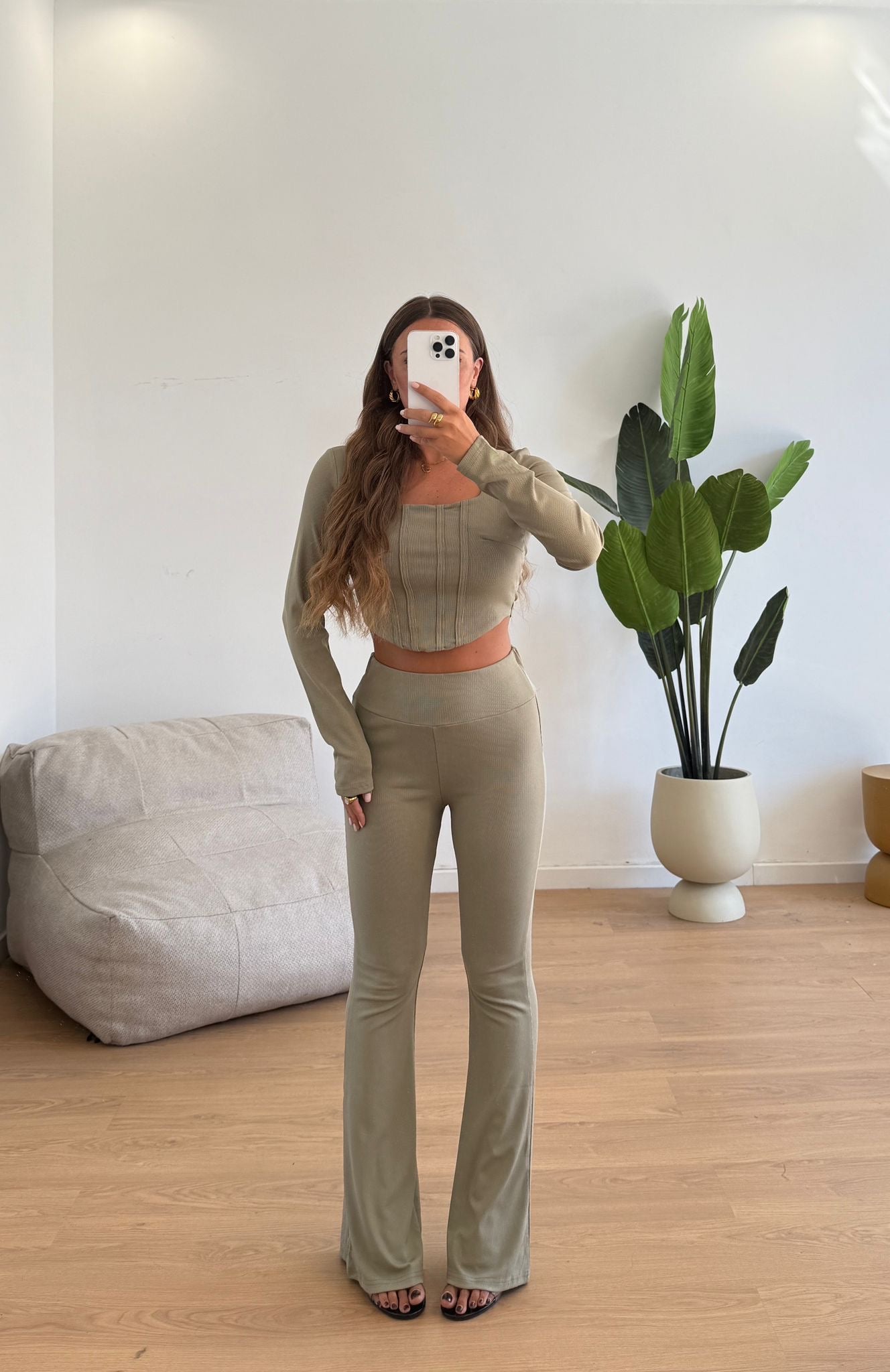 Coordinato da donna a constine tessuto elasticizzato composto da maglia e pantalone a zampa e veste regolarmente la propria taglia e la modella indossa taglia S/M