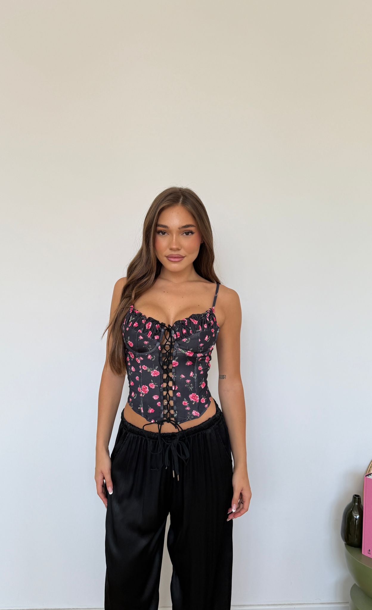 Corpetto da donna a fantasia fiori con coppa sfoderata e bretelle regolabili e veste regolarmente la propria taglia e la modella indossa taglia S