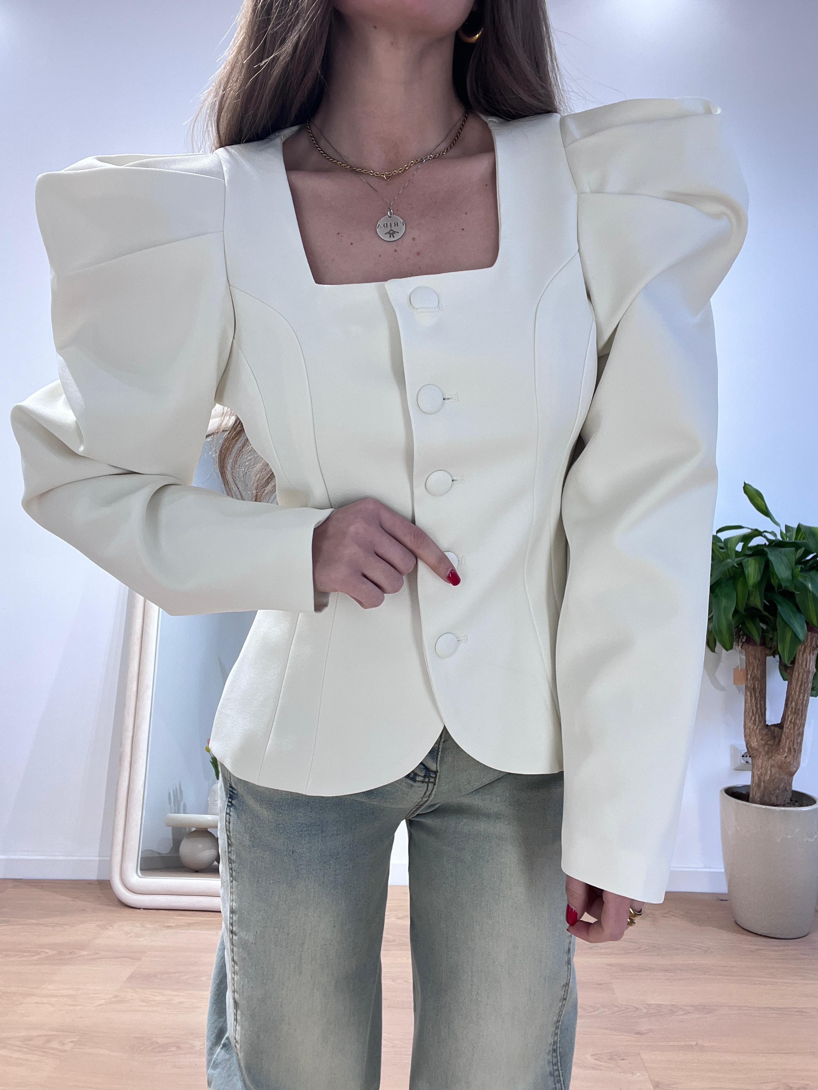 Giacca da donna con scollo quadrato sul davanti e chiusura con bottoncini rivestiti e particolarità con spalle a buffo, veste regolarmente la propria taglia e giusy indossa taglia S