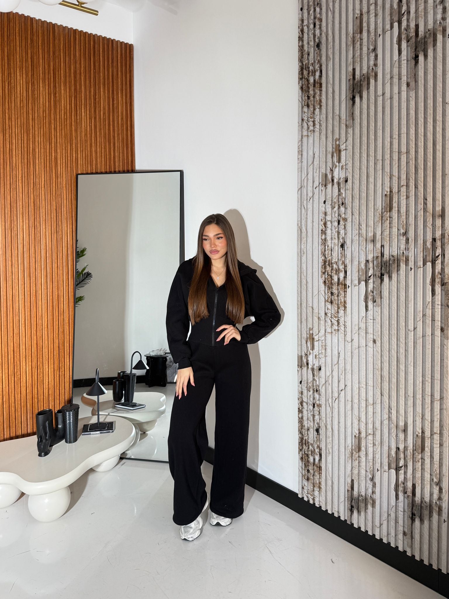 Tuta da donna felpata internamente in pile con polsini, cappuccio e chiusura con zip. Taglia unica, tessuto elasticizzato, veste bene fino ad una taglia M/L. La modella è alta 1,65 e pesa 52/53kg.