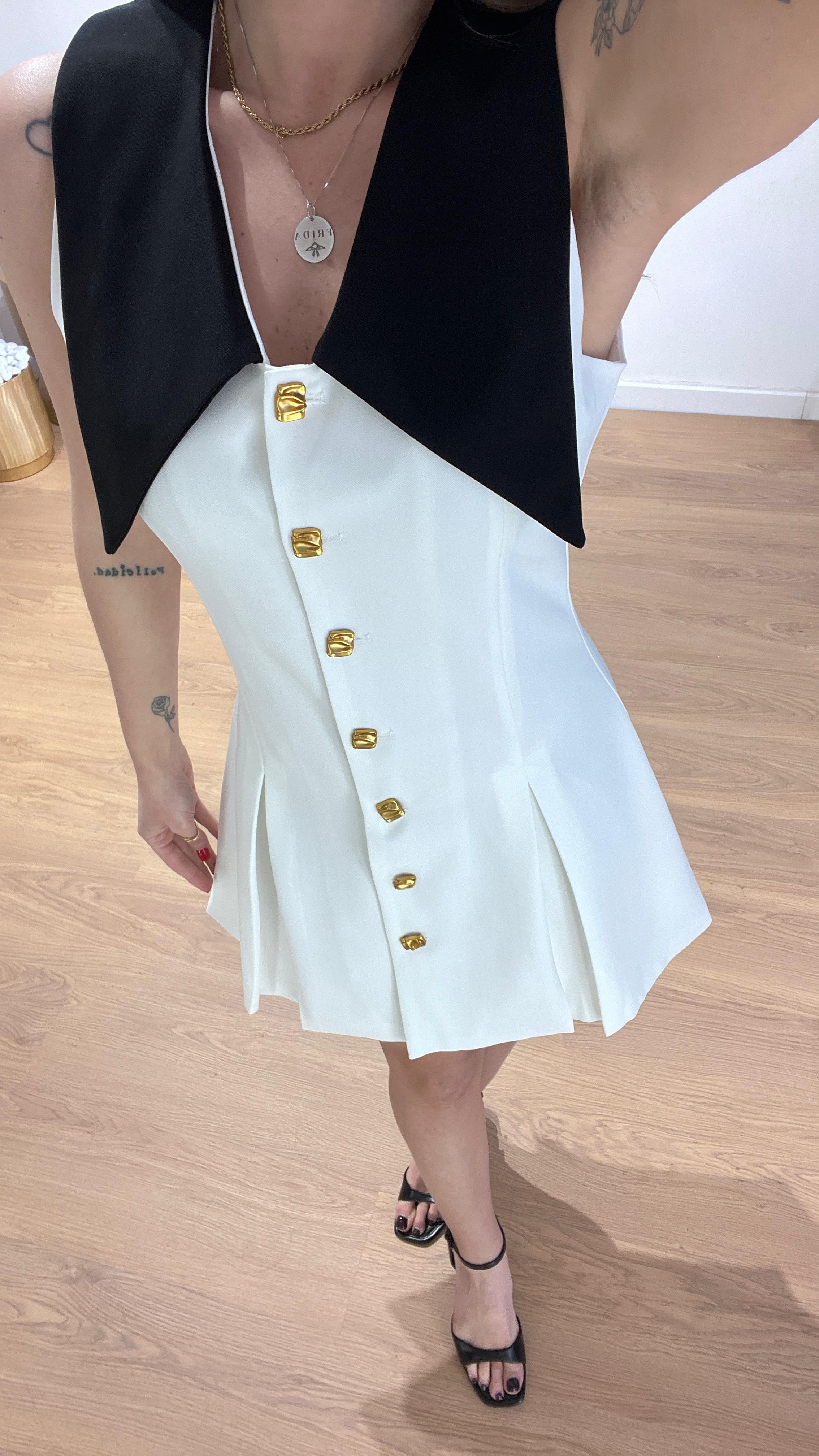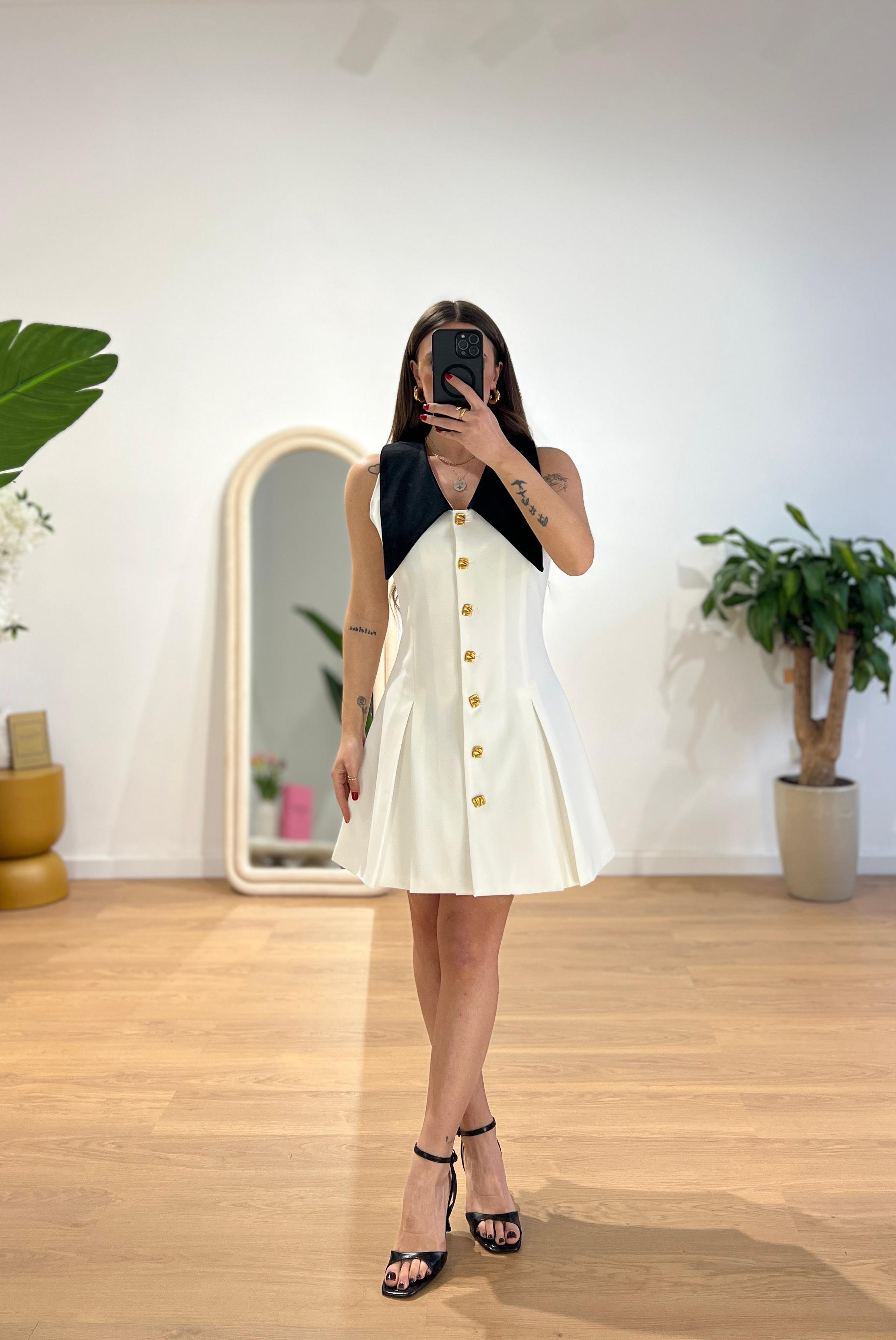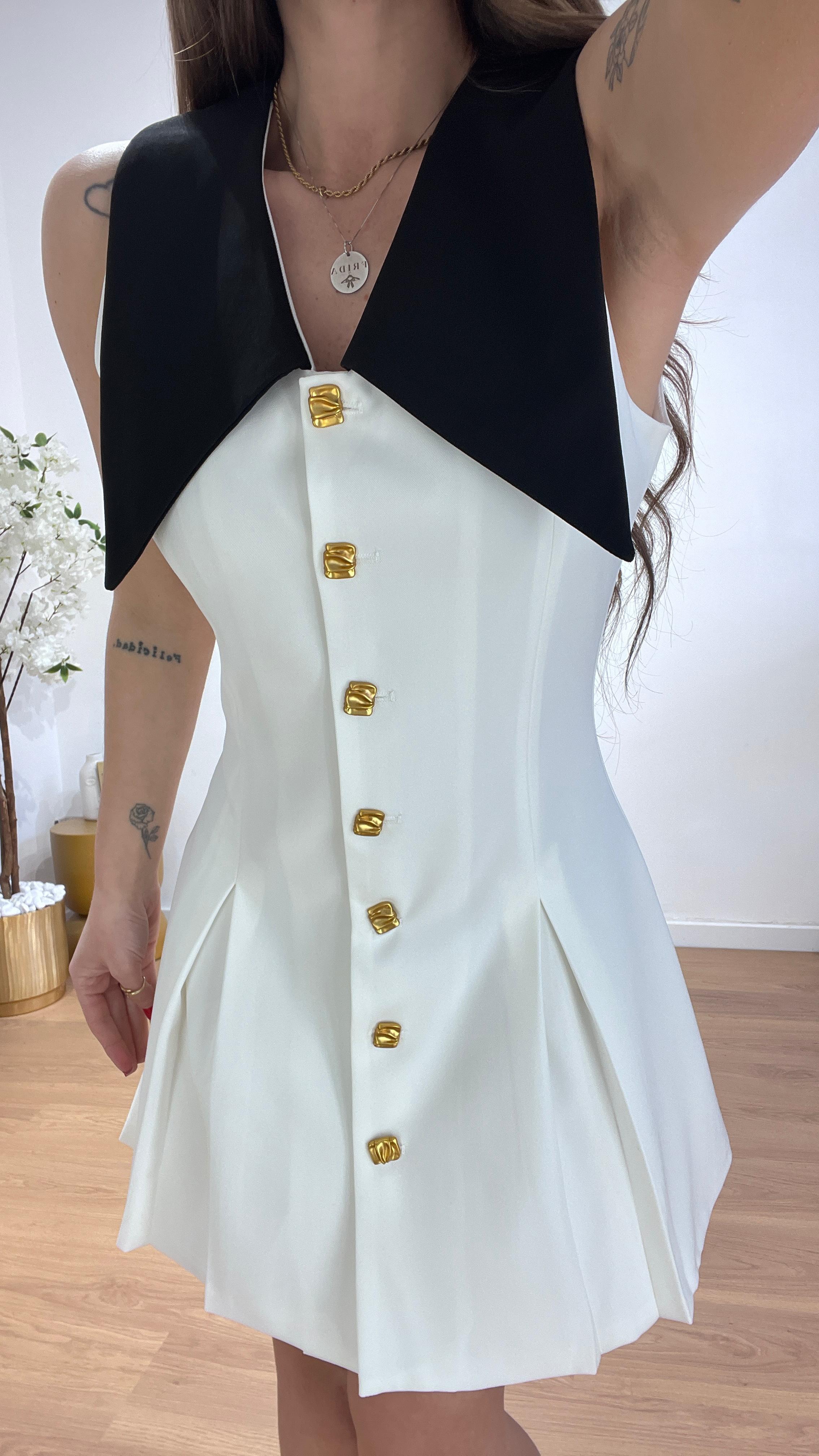 Vestitino da donna in tesuto cotone spesso con chiusura bottoncini in oro sul davanti e colletto a camicia, veste regolarmente la propria taglia e giusy indossa taglia S/M