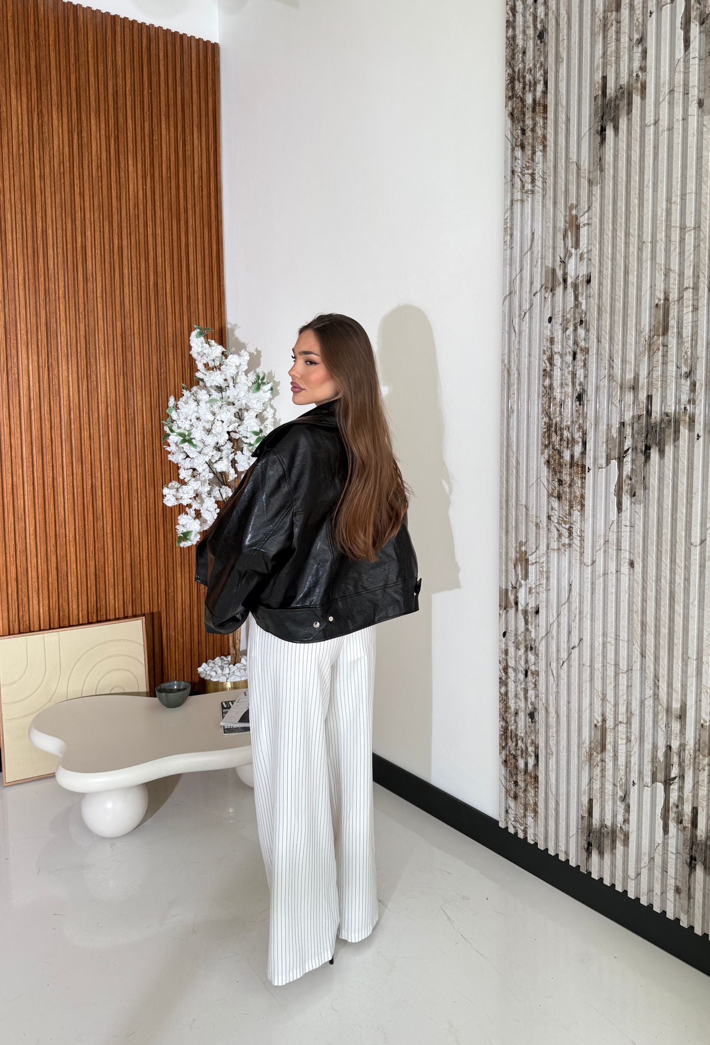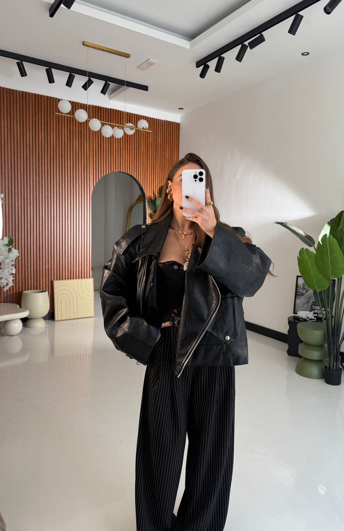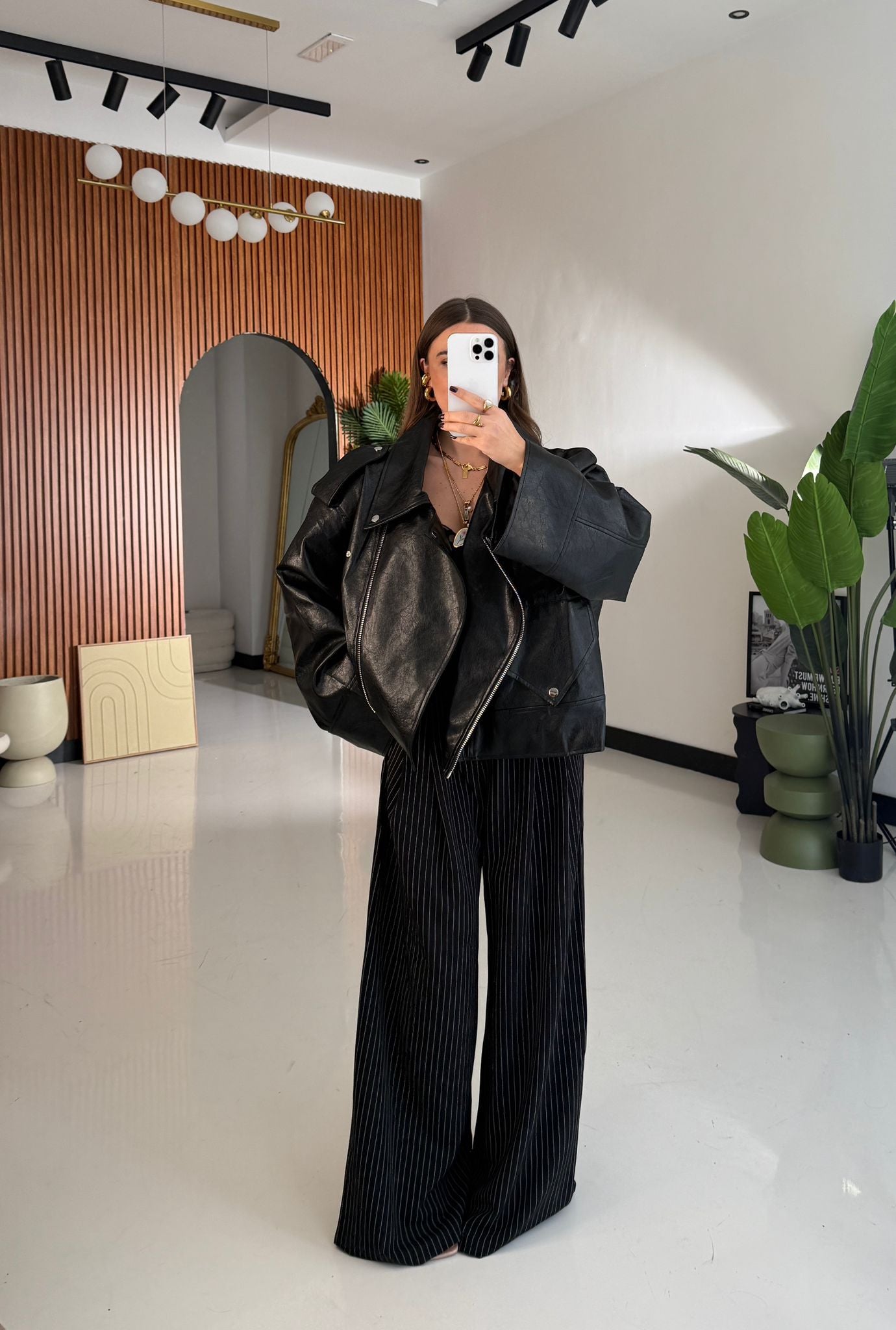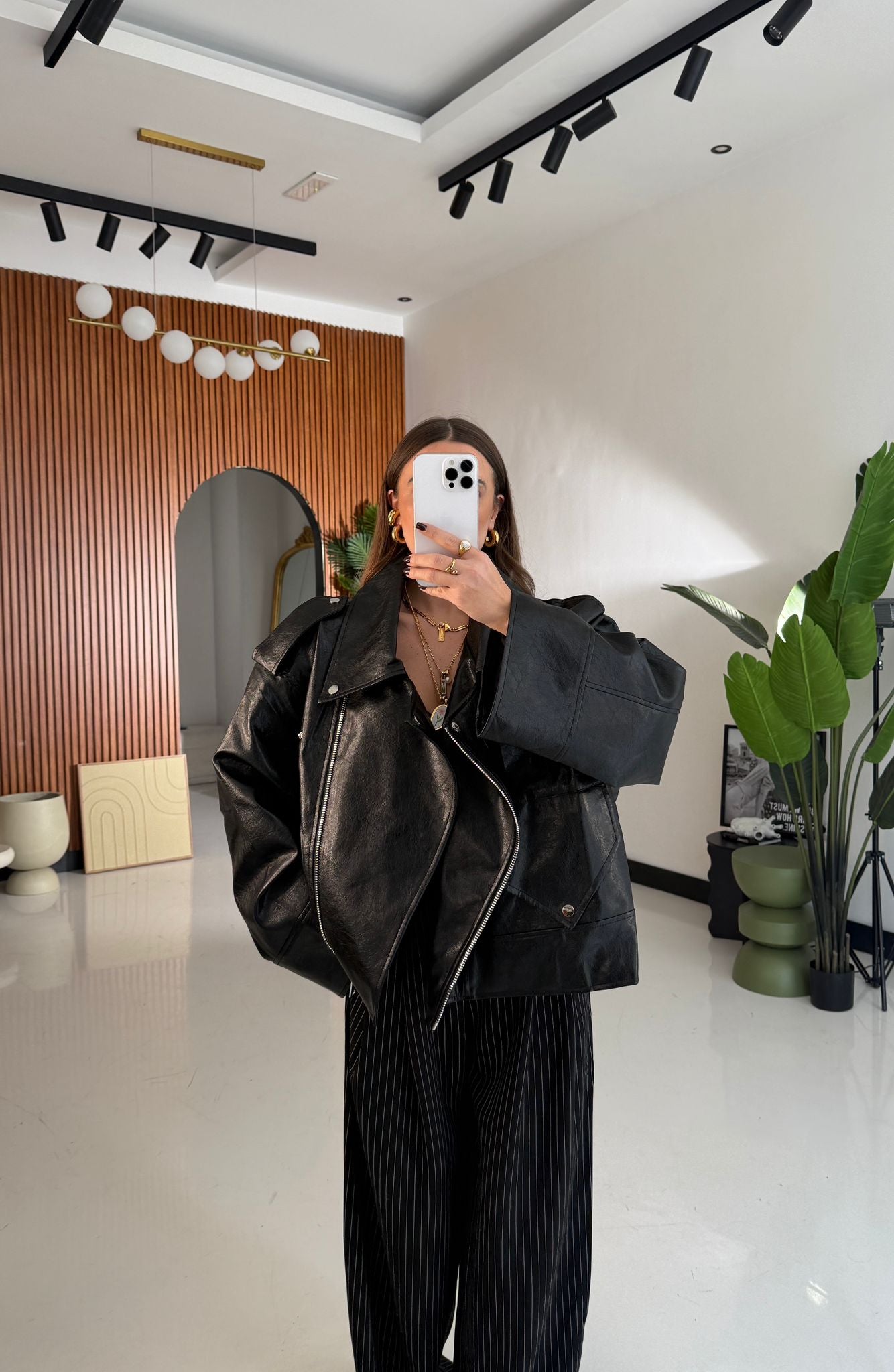 Chiodo da donna top quality in ecopelle semi lucida, vestibilità oversize con chiusura in zip sul davanti. Vestirà bene fino ad una L/XL e la modella è alta 1,65 e pesa 52/53 kg