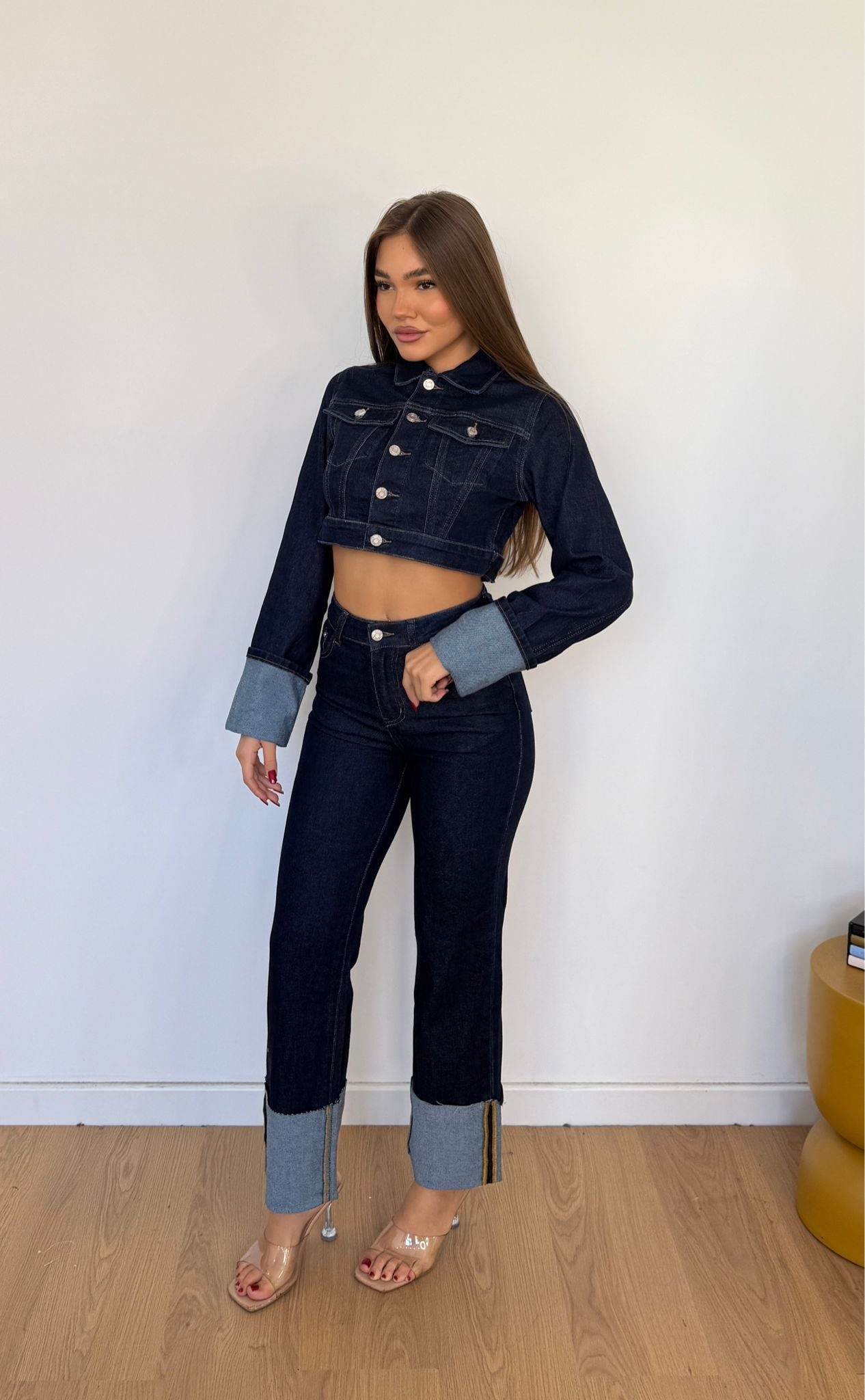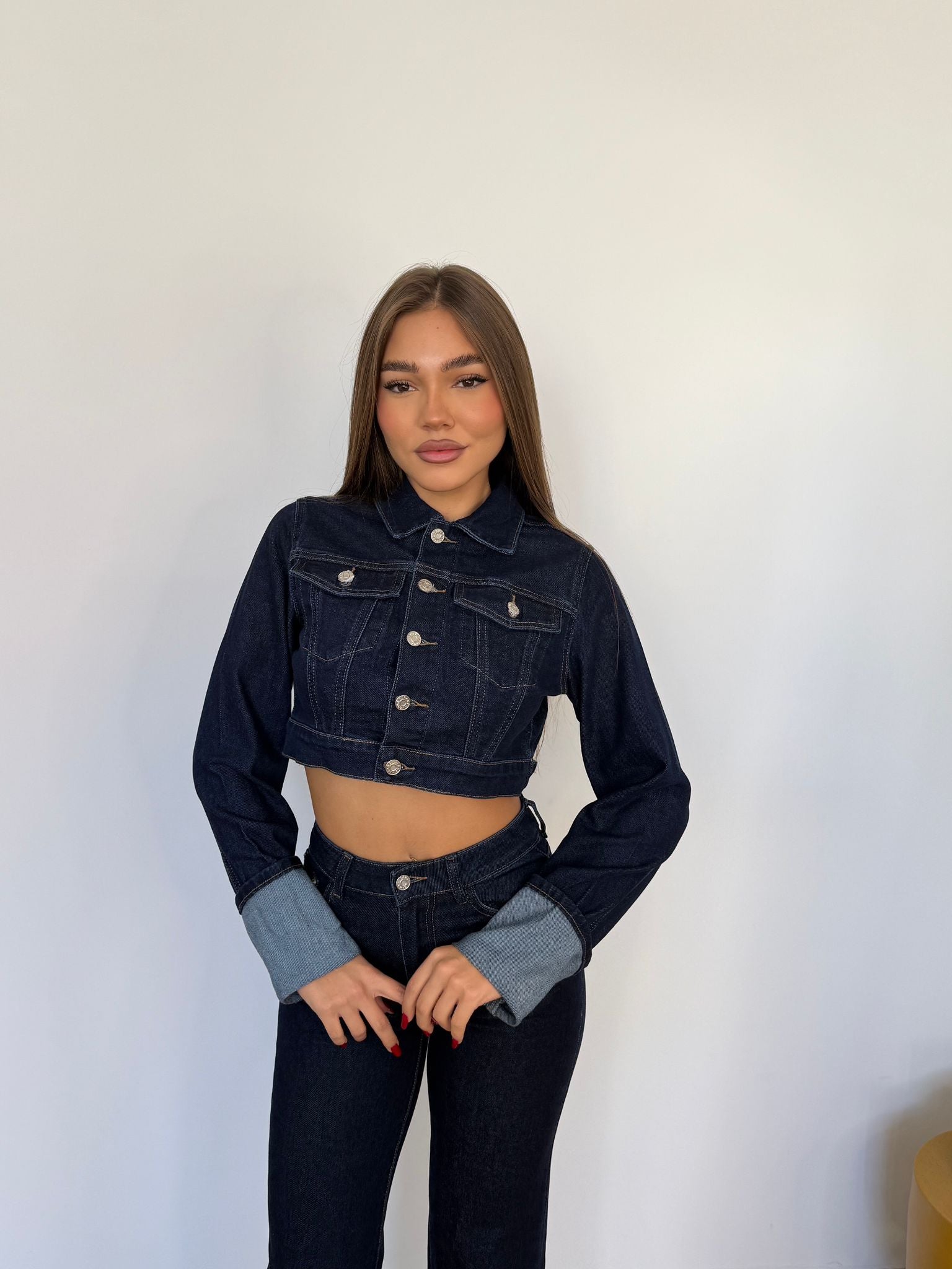 Coordinato da donna composto da Giubbino crop e pantalone tessuto semi elasticizzato con piegone cucito sul finale e veste regolarmente la propria taglia e la modella indossa taglia XS