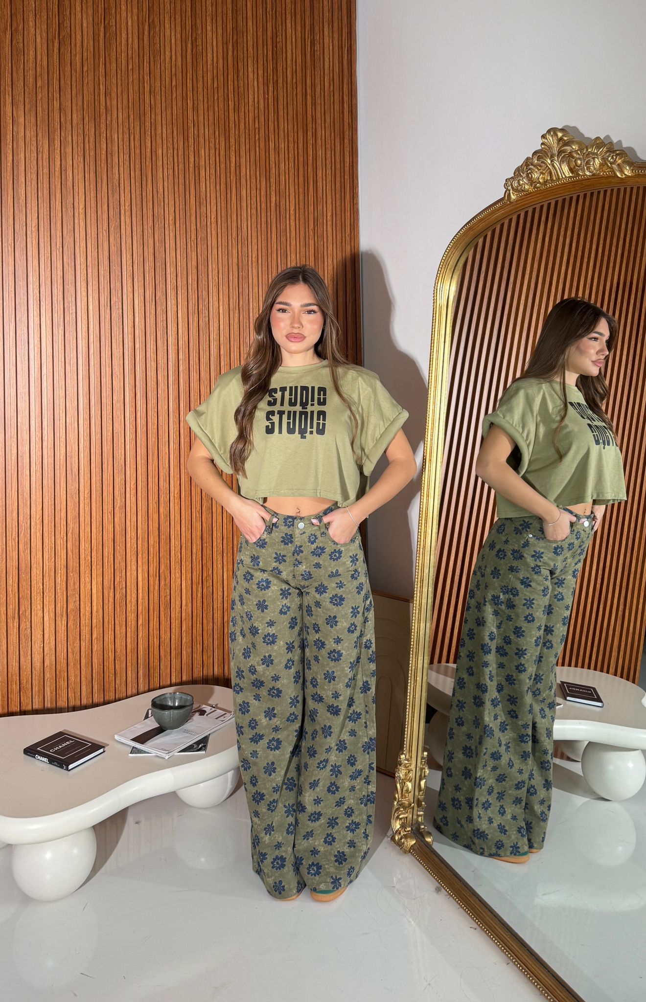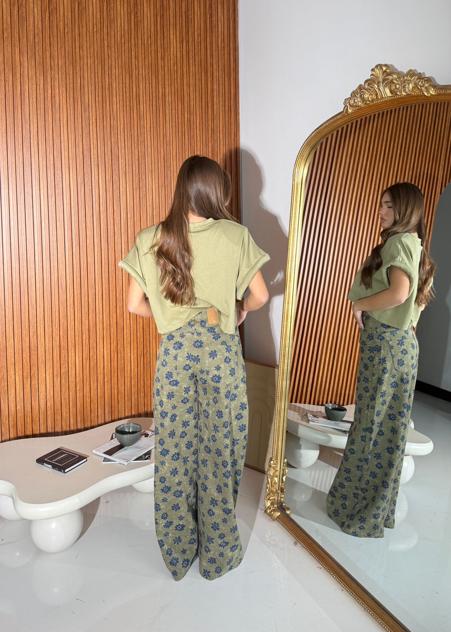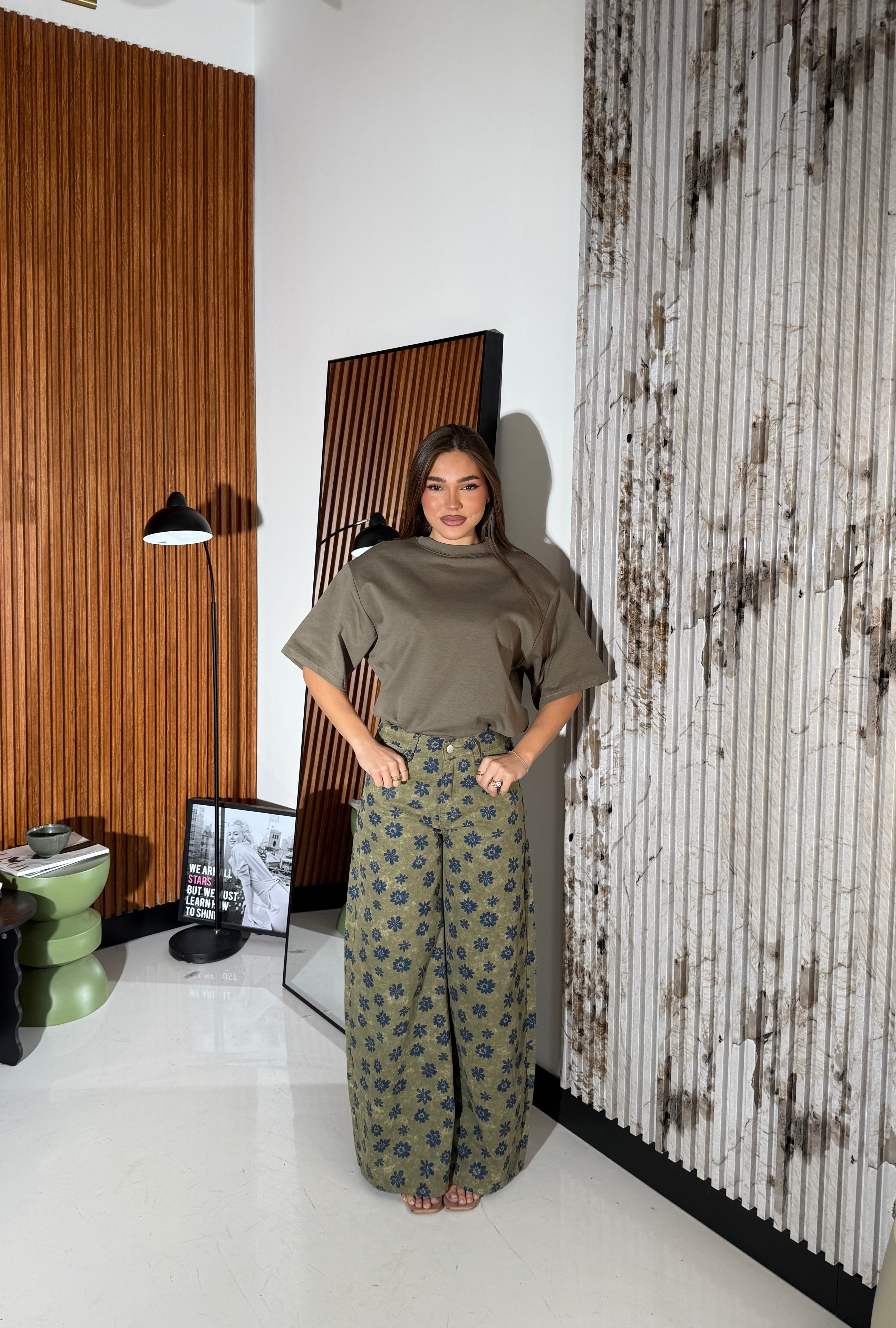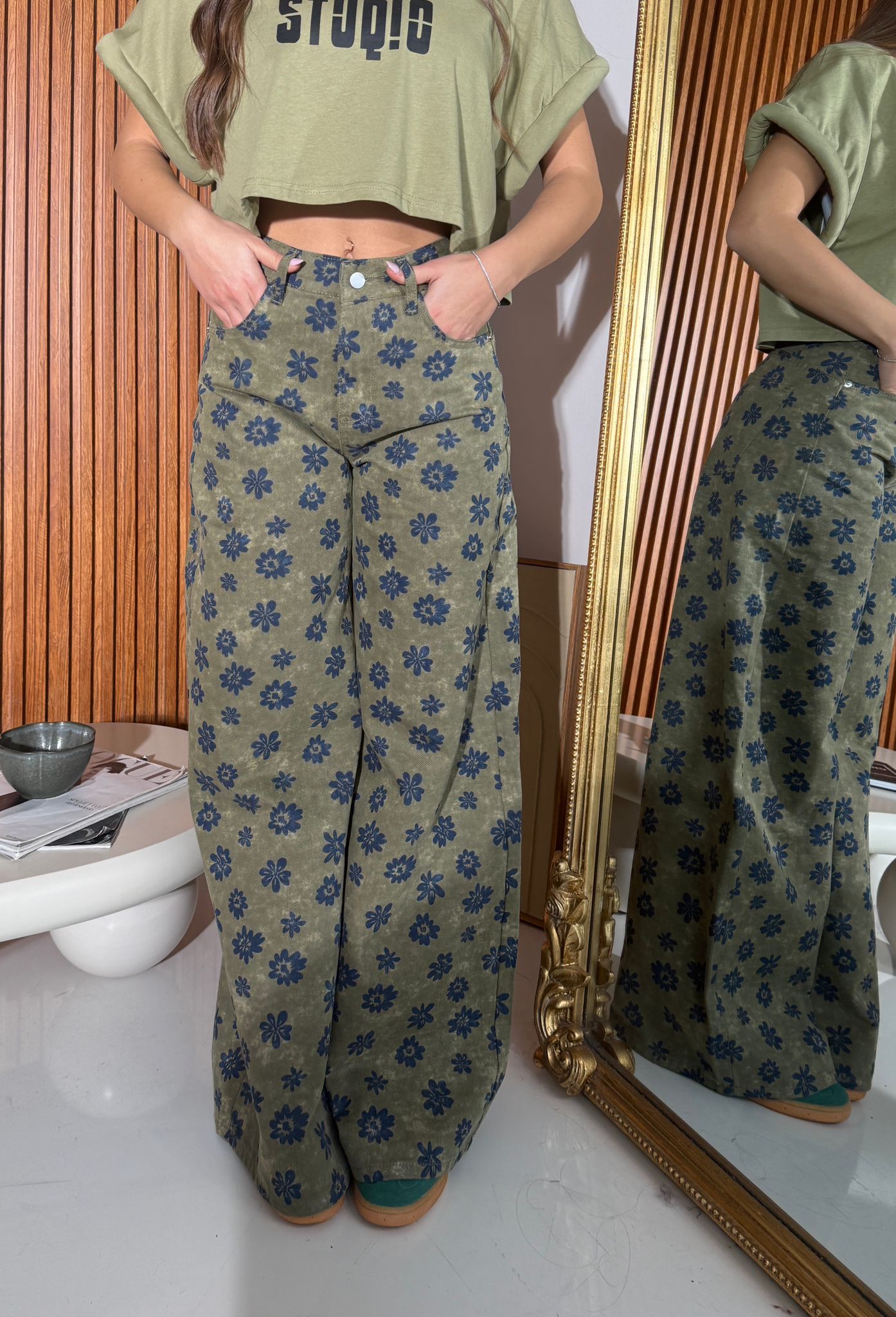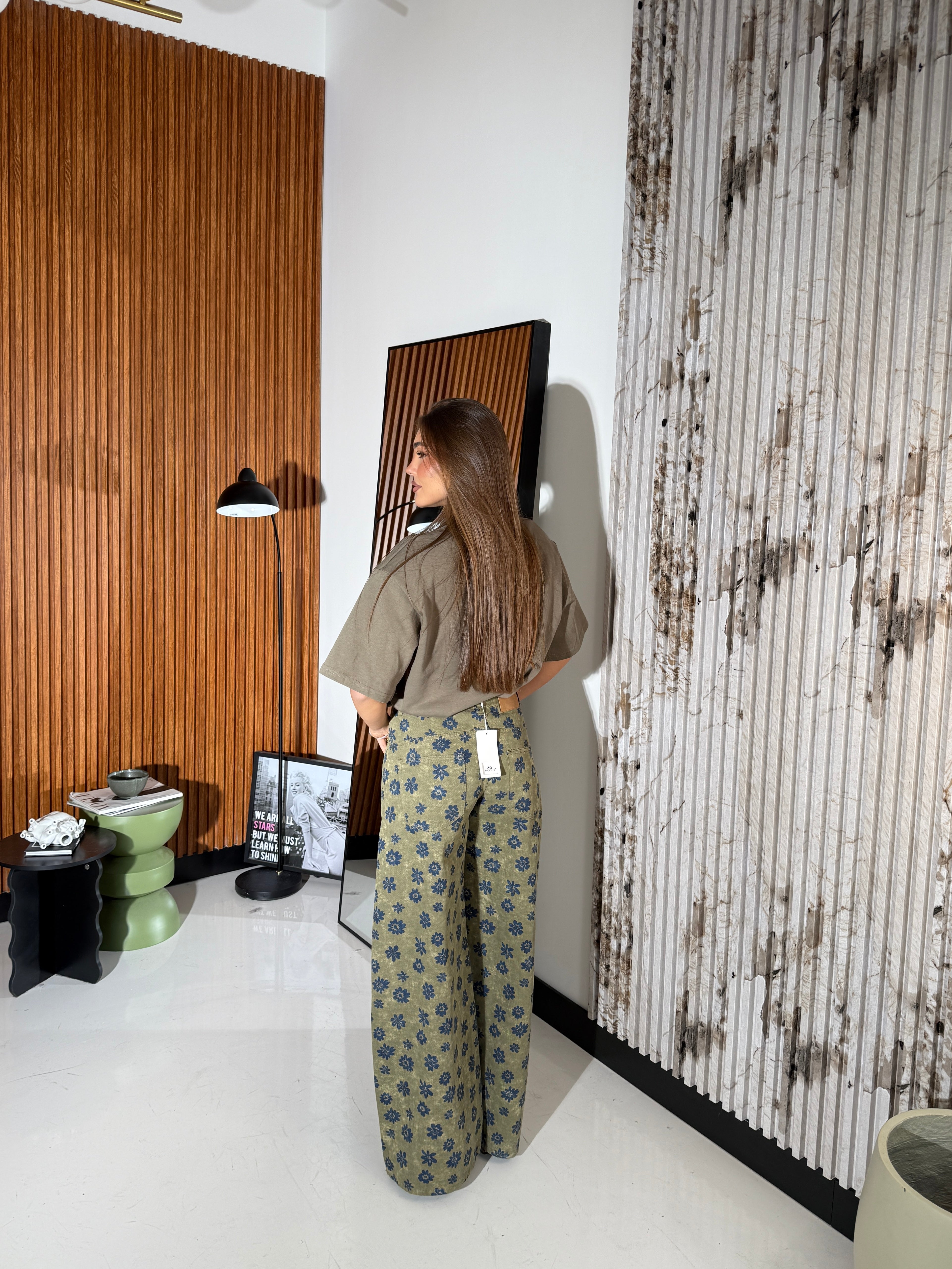 Jeans da donna a fantasia fiori modello a gamba larga con tasche, tessuto tela fissa non elasticizzato e veste bene la propria taglia. La modella indossa taglia S ed è alta 1,65 e pesa 52/53 KG.